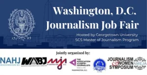 The job fair is organized by the DC chapters of the National Association of Hispanic Journalists, the National Association of Black Journalists, the Asian American Journalists Association, NLGJA: The Association of LGBTQ+ Journalists, the Society of Professional Journalists, our newest partner, the Arab and Middle Eastern Journalists Association (AMEJA) and the Journalism & Women Symposium (JAWS).