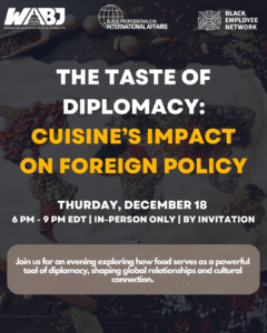 The Washington Association of Black Journalists (WABJ), Black Professionals in International Affairs (BPIA), and the FTI Black Employee Network (FTI–BEN) have joined together to spotlight a powerful intersection of culinary arts and international affairs. The exclusive joint event will feature Jeremiah Knight, Deputy Director for the Africa Bureau’s Office of Public Diplomacy and Public Affairs US State Department, and author of “Diplomat in the Kitchen” for an evening of networking, conversation, and light bites inspired by his culinary diplomacy.