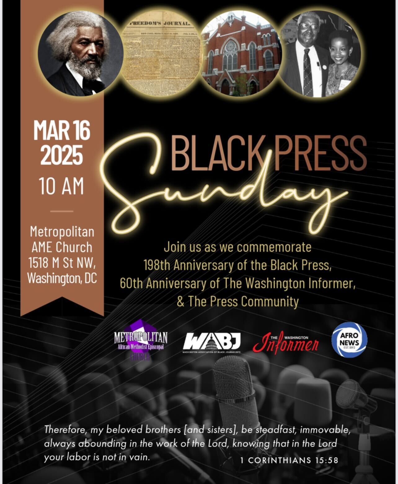 In honor of 198 years of Black Press and 60 years of The Washington Informer and The Press Community, we are commemorating on Black Press Sunday at the historic Metropolitan AME Church at 10 a.m. Join us!